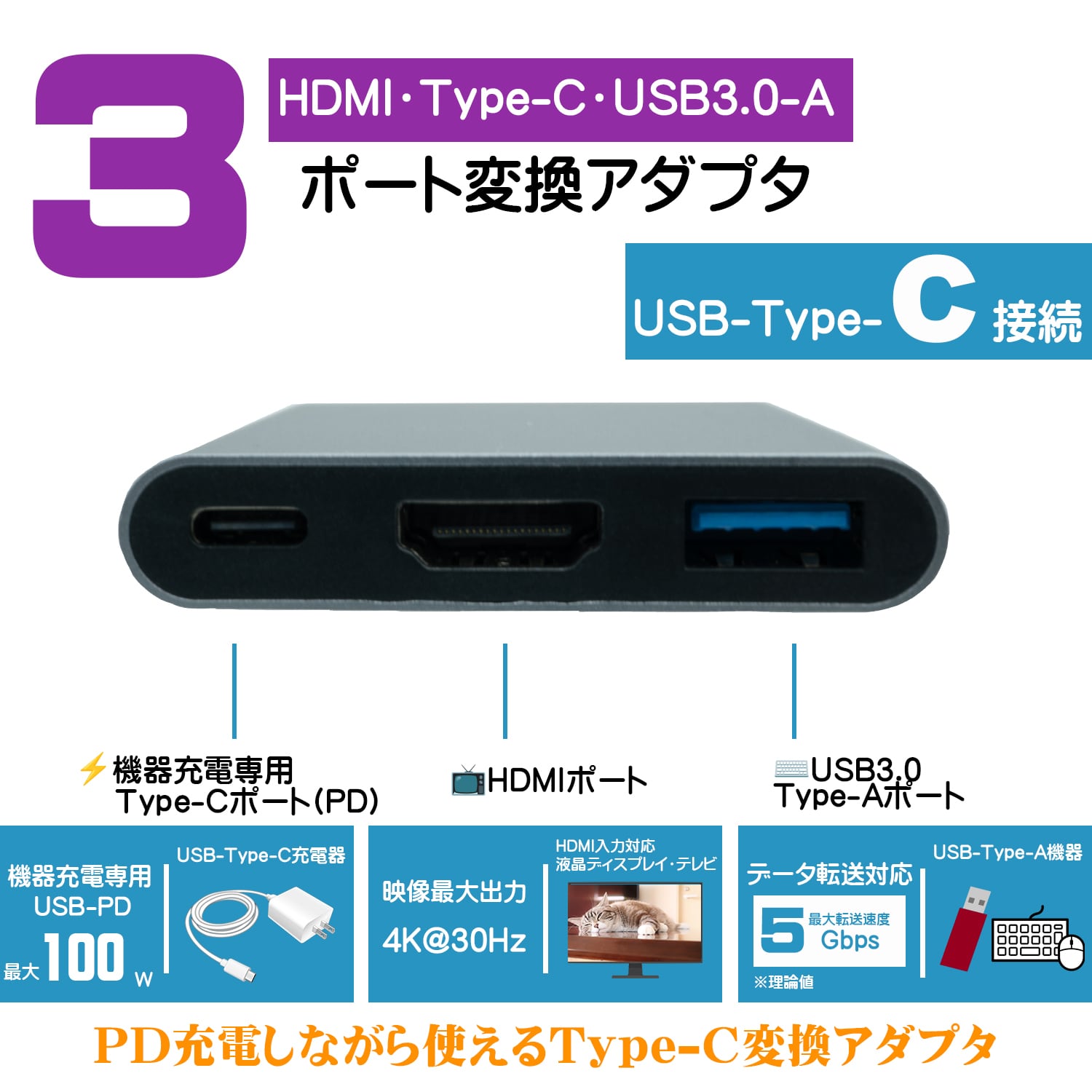 HDMI出力端子、USB3.0Type-A端子、USB Type-C外部から充電出来るPD対応の充電専用端子など、
