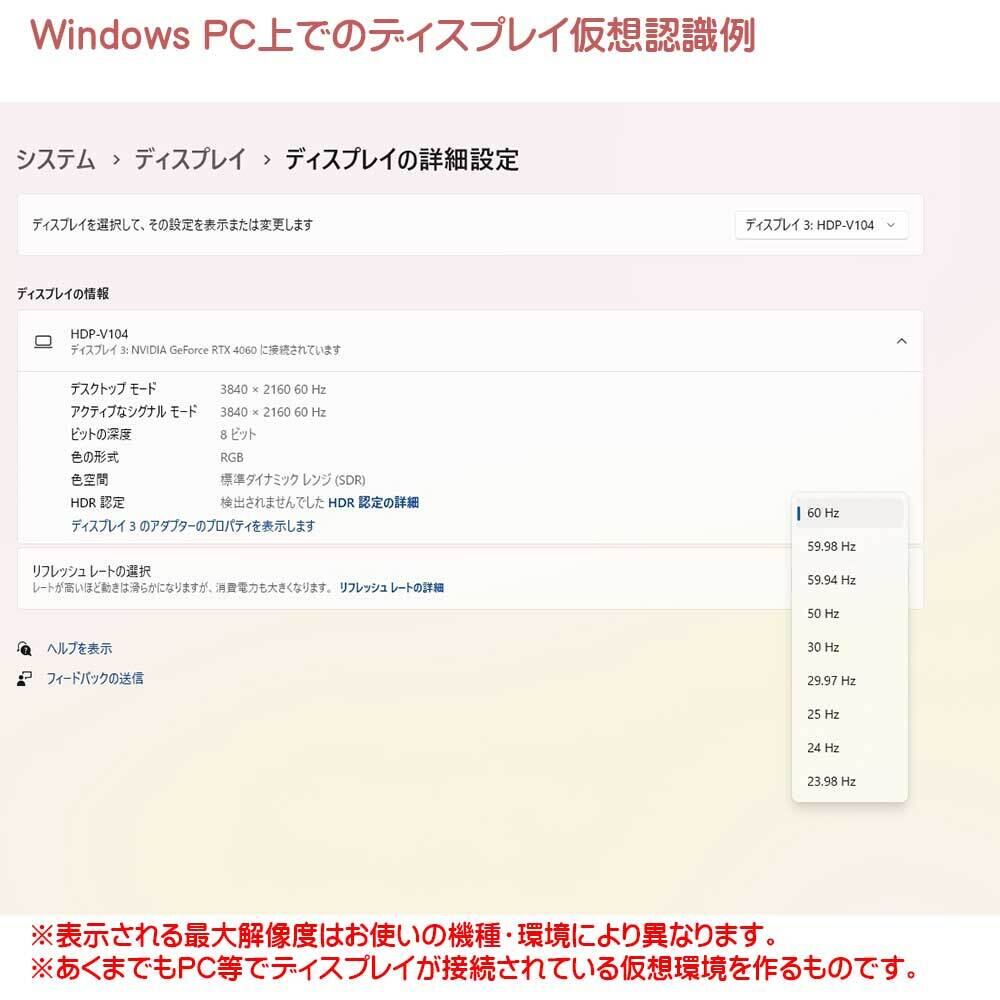 ※最大解像度はお使いのデバイスの解像度までとなります。リフレッシュレート4K環境では17Hzとなる場合がございます。