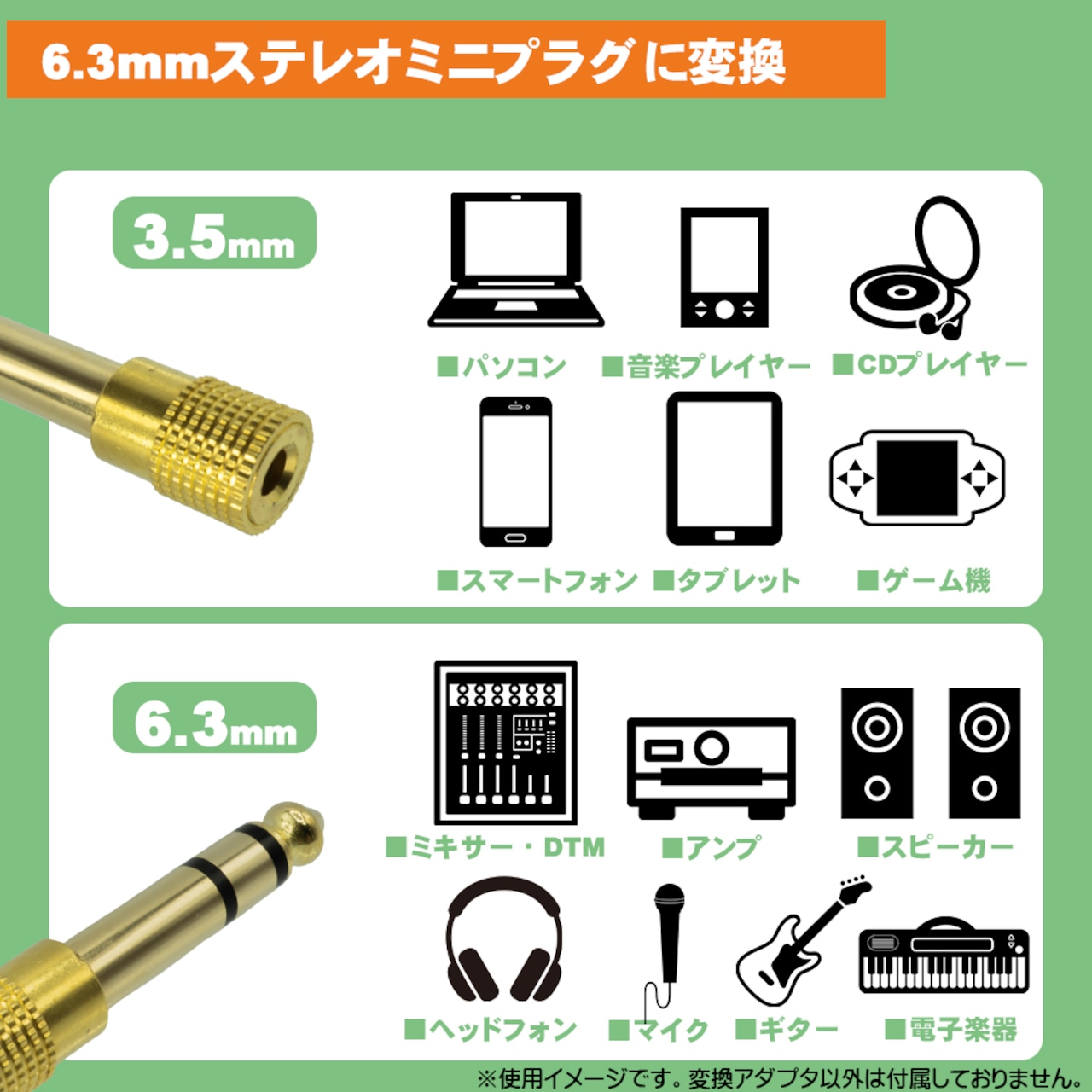・主な用途:パソコン、音楽プレイヤー、スマートフォン、アンプ、スピーカー、DTM、ヘッドホンなどの3.5mm仕様を6.3mm対応ジャックに変換