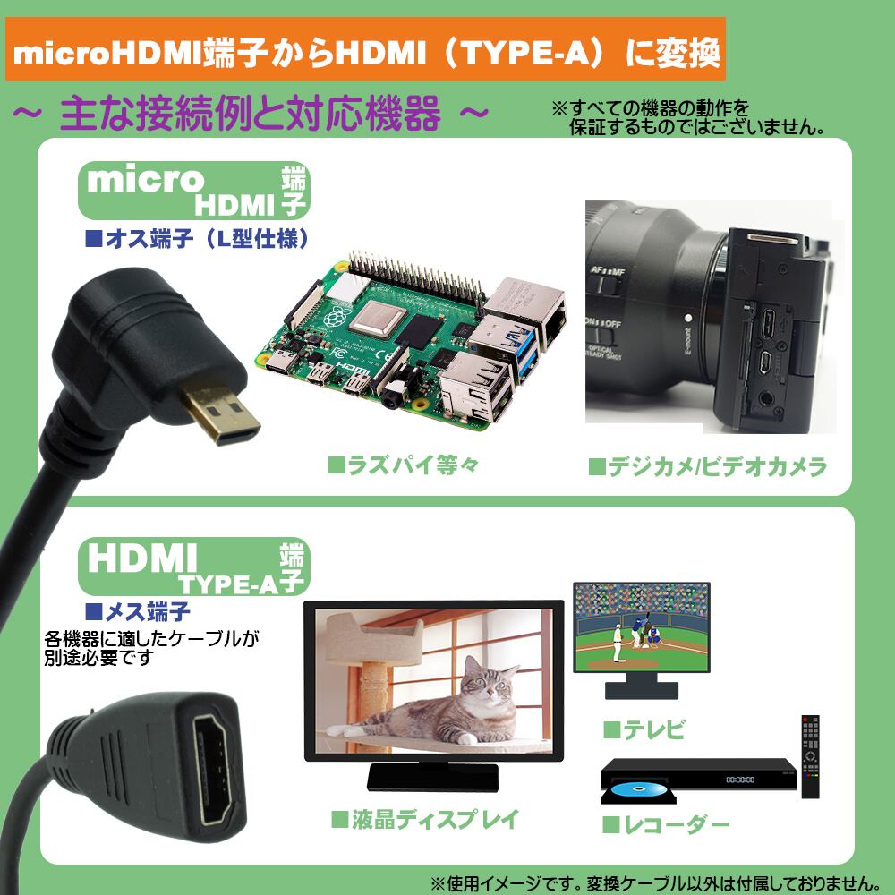 microHDMIを通常のHDMIに変換することでデジカメ、ビデオカメラ、ラズパイ等のmicroHDMI搭載機器を